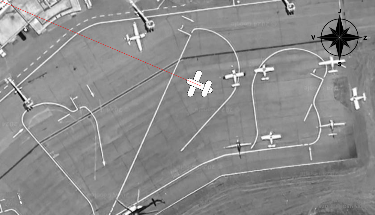 Okrem iného obrázok zobrazuje lietadlo, ktoré letí na určité miesto v smere červenej čiary. Toto miesto je od konkrétneho bodu na letisku vzdialené práve 4100m. Poslednou indíciou je kompas vpravo hore, ktorý ukazuje na juh, čo značí, že obrázok je obrátený.